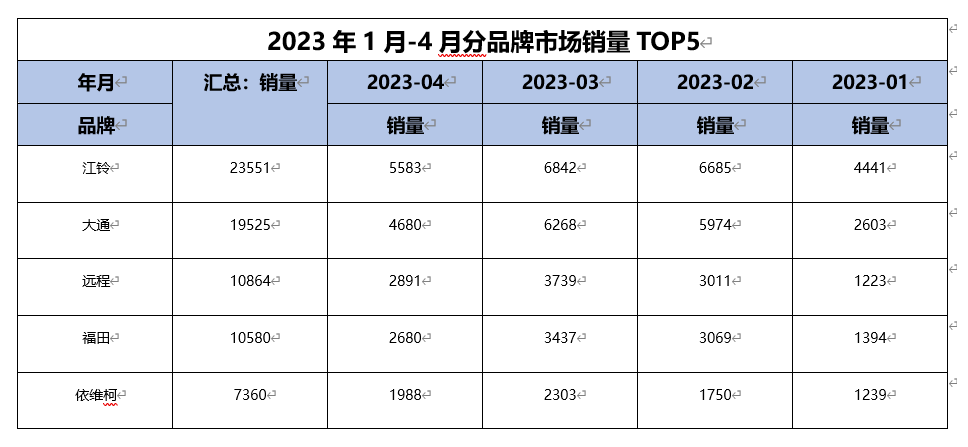 今年燃油车市场的发展相较于往年更加火热,最新出炉的轻客市场1-4月保险数据显示,江铃、大通、远程、福田、依维柯在众多汽车品牌之中杀出重围,取得了排行榜前5名的优秀成绩。其中江铃位列榜首,1月-4月各月份销量均属第一,毫无悬念地凭借23551的总销量稳坐中国轻客市场终端销量冠军的宝座;大通终端总销量为19525辆,与江铃相差4026辆,居于行业第二;远程终端总销量为10864辆,位居行业第三;而福田与依维柯,也分别以10580辆与7360辆的终端总销量,得到了排行榜中第四名、第五名的优秀成绩。