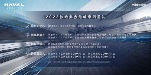 在动力、驾控、空间和配置方面的出色表现,2023款哈弗赤兔完全满足大家对于“一车多用”的个性化出行需求。而现在选购2023款哈弗赤兔,还可享受购车无忧礼、畅享智联礼、贴心质保礼、超值置换礼在内的畅享四重购车礼遇。