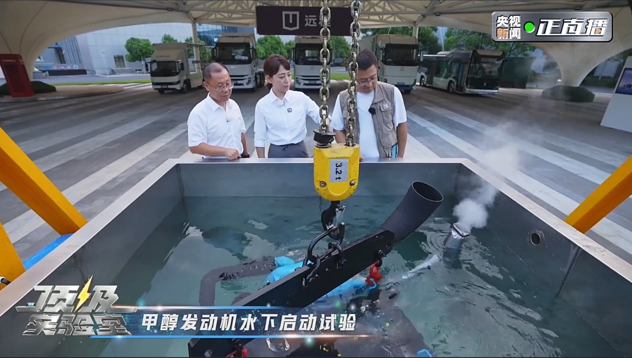 《顶级实验室》栏目组将发动机整体投入1.5米深的水箱中,并对甲醇发动机进行点火,验证电子电器元件的防水性能和发动机的密封性能,最后试验圆满成功,甲醇发动机运行平稳,成功验证其在大雨、洪涝极端场景下的运行状态。