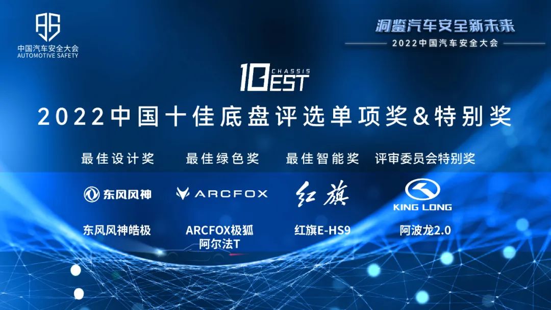 作为车辆开发过程中的重要一环,底盘技术也在不断寻求突破和创新。在首次中国十佳底盘评选中,极狐阿尔法T、东风风神皓极、东风雪铁龙天逸BEYOND C5 AIRCROSS、HiPhi Z、红旗E-HS9、红旗HS5、林肯Z、岚图梦想家、UNI-V IDD和广汽传祺影酷获得“2022中国十佳底盘”大奖,东风风神皓极获得最佳设计奖、极狐阿尔法T获得最佳绿色奖、红旗E-HS9获得最佳智能奖、阿波龙2.0获得评审委员会特别奖。